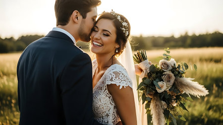 Beautiful bride and groom on their wedding day in a wheat field