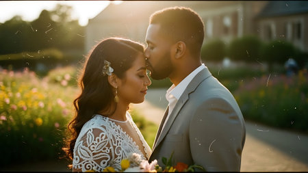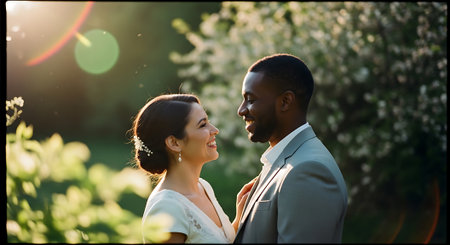 A smiling interracial couple stands together in a lush garden, bathed in warm sunlight, conveying a sense of love, happiness, and togetherness on a beautiful day.