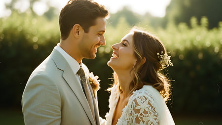 Bride and groom smile at each other outdoors in warm sunset glow, capturing a candid, intimate wedding portrait with soft bokeh and festive atmosphere.