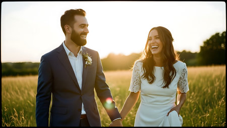 A smiling man and woman, dressed in white, walk hand in hand through a serene field of tall grass, bathed in warm sunlight during a beautiful sunset.