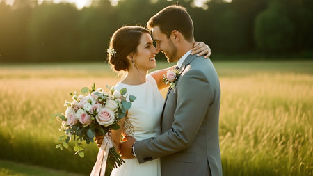 A bride and groom embrace in a field of flowers, AI