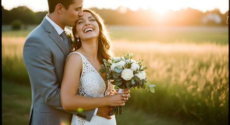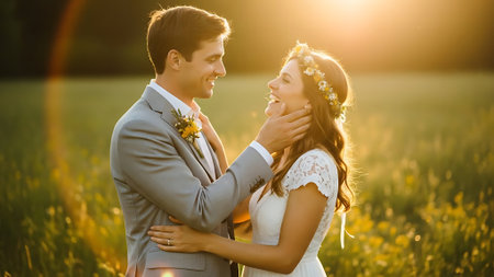 A happy couple embracing in a beautiful field at sunset