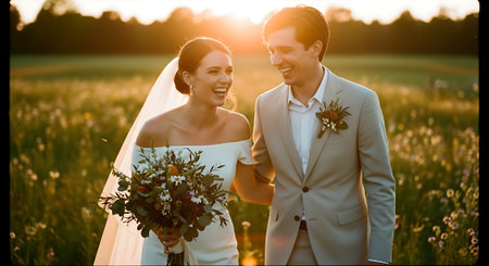 A smiling bride and groom walk together, hand in hand, through a lush green field at sunset, surrounded by warm light and beautiful wildflowers.