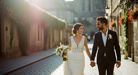 A smiling bride and groom, dressed in formal attire, stroll hand in hand down a charming cobblestone street lined with historic buildings and vibrant flowers.
