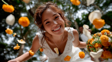 ant eye view , african bride happy moment in wedding day , falling flower