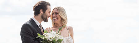 Cheerful groom hugging bride with bouquet outdoors, banner
