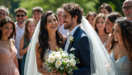 A radiant bride and groom share a heartfelt moment, surrounded by smiling friends and family in a lush outdoor setting. The scene captures the essence of love and joy, with the bride holding a bouquet of white roses, embodying elegance and happiness on their special day.