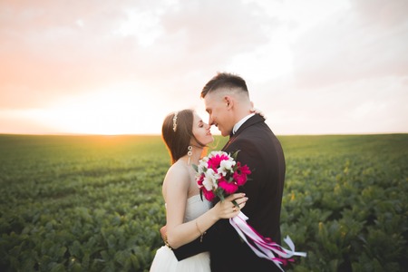 Beautiful wedding couple, bride and groom posing in field at sunset