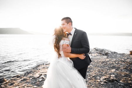 Beautiful bride and groom on their wedding day. Bridegroom and bridegroom at sunset.