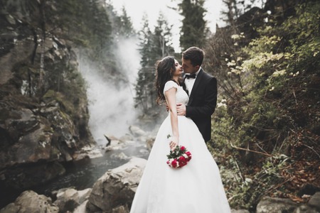 Elegant stylish happy brunette bride and gorgeous groom on the background of a beautiful river in the mountains