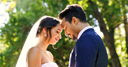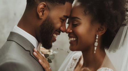 Tender moment between an interracial bride and groom, showcasing love and elegance on their wedding day