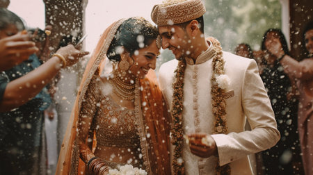 Happy wedding pictures of the bride and groom at their wedding ceremony. Wedding custom sprinkled with rice and grain, Generative AI
