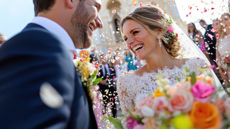 Joyous wedding scene with bride and groom, confetti rain, colorful, festive atmosphere. AI generative.