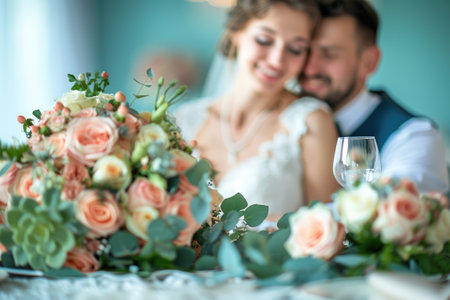 Focus on a beautiful wedding bouquet with a newlywed couple sharing a kiss in the background