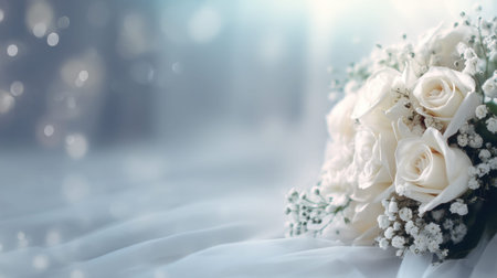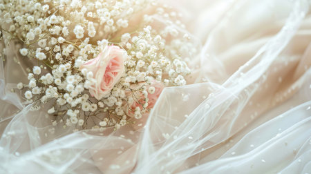 A soft bouquet of delicate babys breath and beautiful roses on silky fabric, creating a dreamy look