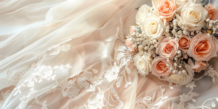 A beautiful and delicate bridal bouquet elegantly resting on luxurious wedding dress fabric with finesse and charm