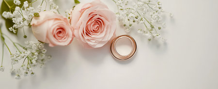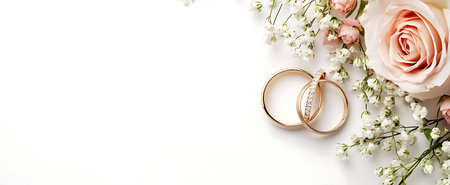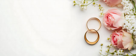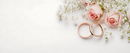 A beautiful arrangement of wedding rings placed next to delicate pink roses and baby's breath on a clean white background, symbolizing love and commitment.