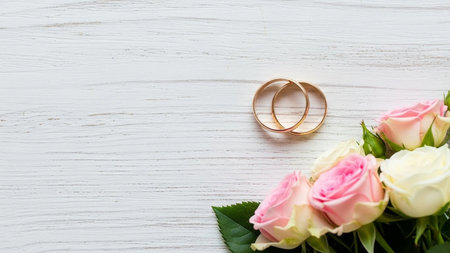 Two golden wedding rings rest on textured white wood surface beautiful bouquet of pink and white roses in corner marriage engagement concept