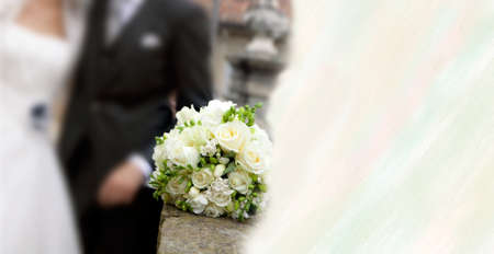 Bridal bouquet of roses and orange blossoms ( on the background a couple) with copy-space.