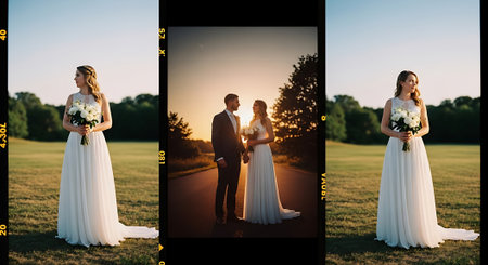 A collage of a bride in a white wedding dress holding flowers, standing alone and with a groom in a suit, set against a serene outdoor backdrop with trees and sunset.