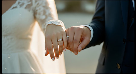 A newly married couple, a man in a black suit and a woman in a white gown, walk hand in hand. The scene evokes love, commitment, and celebration on their special day, with soft lighting and an intimate feel.