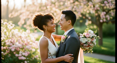 A joyful multiracial newlywed couple stands hand in hand, surrounded by lush greenery and vibrant flowers, with the warm sunlight shining down on them.