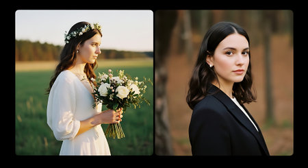 A split screen image of two women, one in a white wedding dress and the other in a black business suit, representing different aspects of life.