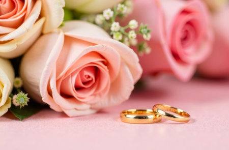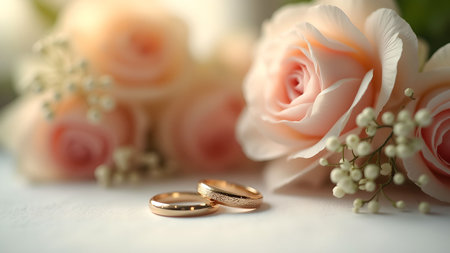A close-up image of a pair of wedding rings placed among pink roses and white flowers on a light background, symbolizing love and commitment.