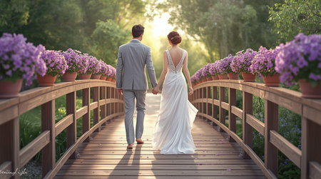 A couple dressed in formal attire stands hand-in-hand on a wooden bridge adorned with vibrant purple flowers. Surrounded by lush greenery and bathed in sunlight, the scene captures a moment of love and serenity, ideal for wedding, engagement, or romantic themes.