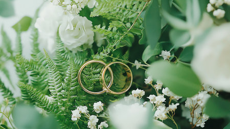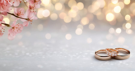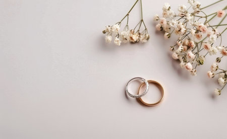 Two wedding bands, one gold and one silver, laid together on a white surface, surrounded by delicate white flowers. The image has a simple and elegant feel, perfect for use in wedding invitations or other romantic designs.