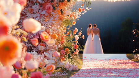 Two lesbian wedding, queer marriage of two brides, loving women couple standing behind flower decoration, overlooking wedding ceremony, two non-traditional brides taking vows on a romantic happy wedding ceremony