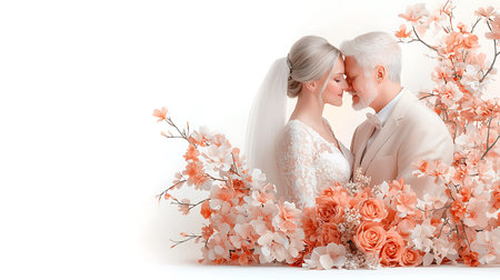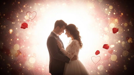 A man and woman in wedding attire embrace tenderly, their foreheads touching. They are silhouetted against a bright, glowing light source, creating a halo effect. The background is filled with soft bokeh lights, stylized floral and floating heart shapes and red rose petals, evoking a sense of romance and celebration. The overall mood is dreamy and magical, wedding or anniversary themes.