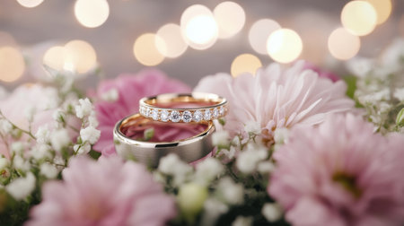 Two beautiful wedding rings, one adorned with sparkling diamonds, rest amidst lush pink roses and small white blooms, creating a romantic and intimate atmosphere.