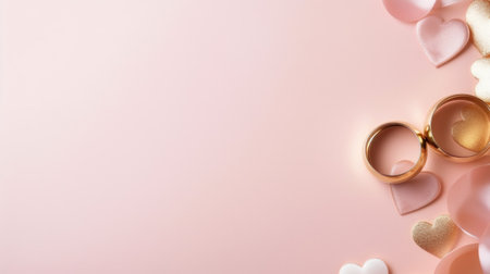 A white card with a pink ribbon and two gold wedding bands on top. The card is surrounded by pink and white flowers, and gold confetti.