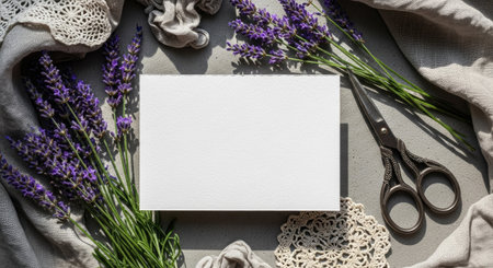 A blank rectangular card rests amidst sprigs of lavender, decorative fabric, and scissors. The image presents a neutral palette with textures of cloth and paper. Ideal for designs, the composition utilizes natural lighting, suggesting indoor use, and is suitable for various editorial and commercial applications.