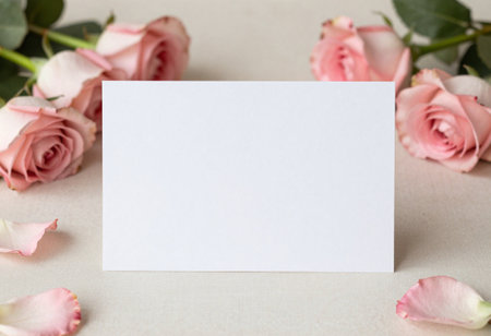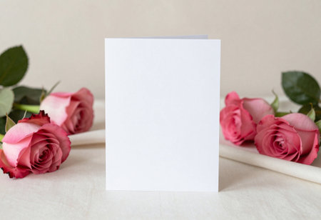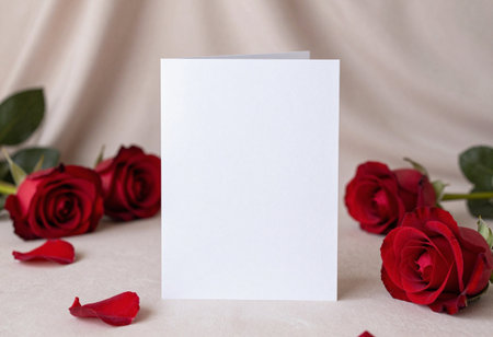 Blank paper card with red roses on a beige background.
