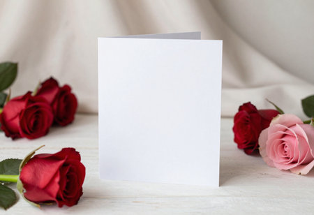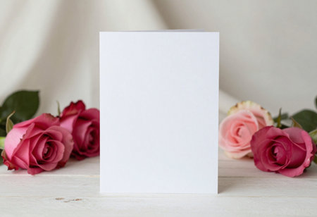 Blank greeting card mockup featuring a delicate floral arrangement. Perfect for showcasing your designs or messages for weddings. anniversaries. birthdays. or any special occasion.