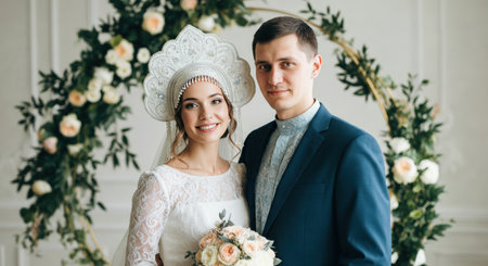 Elegant wedding ceremony with young eastern european couple in traditional attire