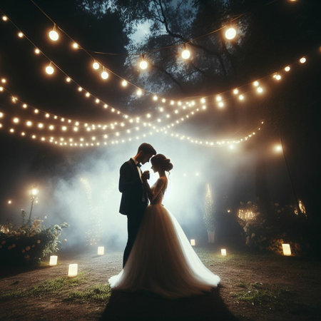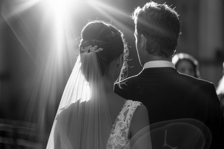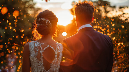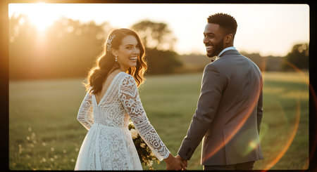 A newly married couple, a man in a black suit and a woman in a white gown, walk hand in hand. The scene evokes love, commitment, and celebration on their special day, with soft lighting and an intimate feel.