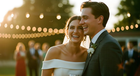 Bride and groom smile at each other outdoors in warm sunset glow, capturing a candid, intimate wedding portrait with soft bokeh and festive atmosphere.