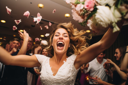 A woman in a white dress celebrates as she is surrounded by colorful confetti, Bouquet toss at a lively wedding reception, AI Generated