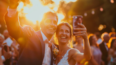 A joyful couple taking a selfie during their wedding at sunset, capturing the warm golden light and celebratory atmosphere.