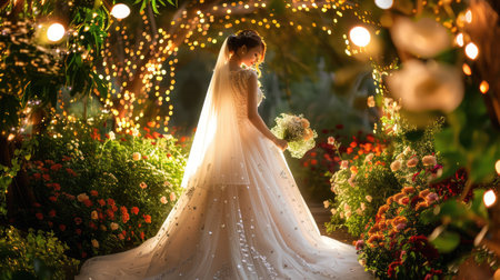 A stunning bride stands in a magical garden filled with vibrant flowers and shimmering fairy lights, capturing the essence of love and beauty on her special day.
