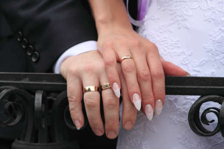 bride holding groom hand, couple's hands with wedding rings. Sign, symbol of family concept