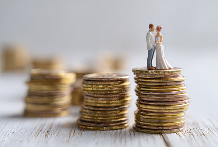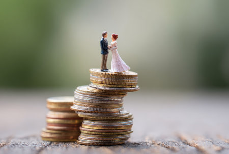 A close-up captures a miniature wedding couple standing atop a stack of coins. The image features a shallow depth of field, with coins in focus and others blurred in the background. Warm lighting emphasizes the texture and color of the coins. The scene could be used to illustrate financial planning or investment themes.