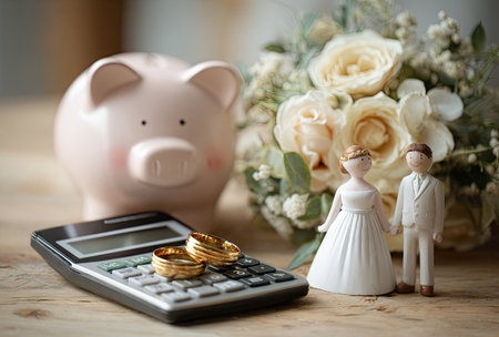 This image presents a wedding concept, with a piggy bank, calculator, wedding rings, and miniature figurines of a bride and groom. The composition features soft lighting with a shallow depth of field, emphasizing the objects against a blurred background. Suitable for financial planning, wedding, and lifestyle themes.