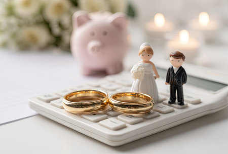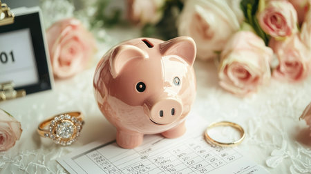 A still life composition features a piggy bank, calculator, wedding rings, floral bouquet, and miniature bride and groom figurines. The scene uses soft lighting and a shallow depth of field, with warm tones. This image could be used for articles, advertising, or marketing materials related to weddings, savings, or relationships, or lifestyle.