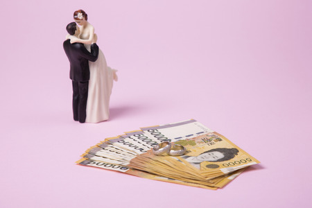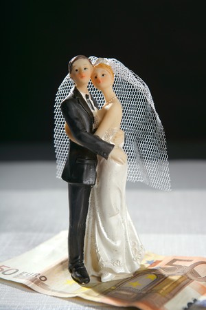 the wedding couple figurine over bank notes