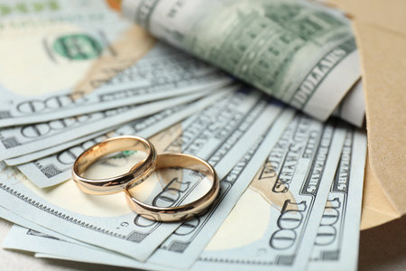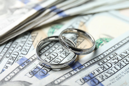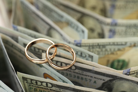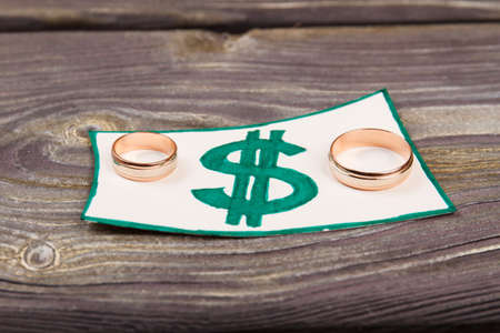 Golden wedding rings on banknotes background. Marriage of