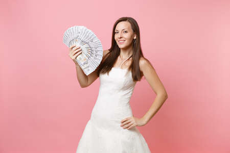 Cropped image of bride woman in wedding dress holding bundle lots of dollars, cash money, mobile phone with blank black empty screen isolated on pink background. Organization of wedding.